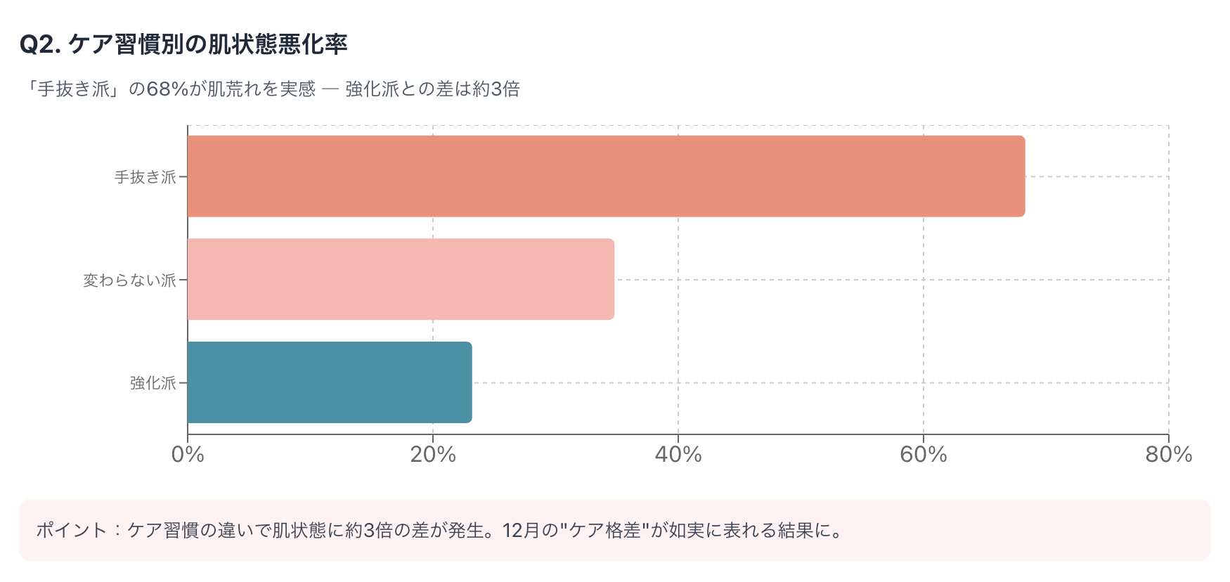 その結果、12月はスキンケアを「強化する人」と「手抜きになる人」がほぼ拮抗しており、この習慣の違いが肌状態に約3倍もの差を生んでいることが明らかになりました。