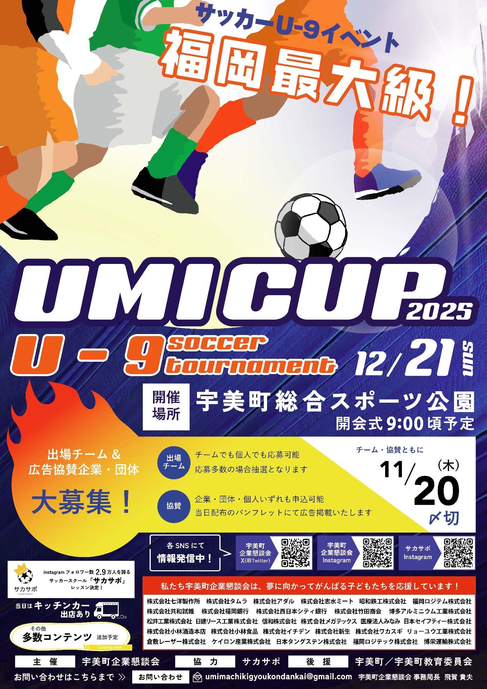 小学3年生以下の子どもたちが熱い試合を繰り広げる「UMIカップ 2025 U-9サッカー大会」が2025年12月21日(日)、宇美町総合スポーツ公園 陸上競技場(福岡県宇美町)にて開催されます。