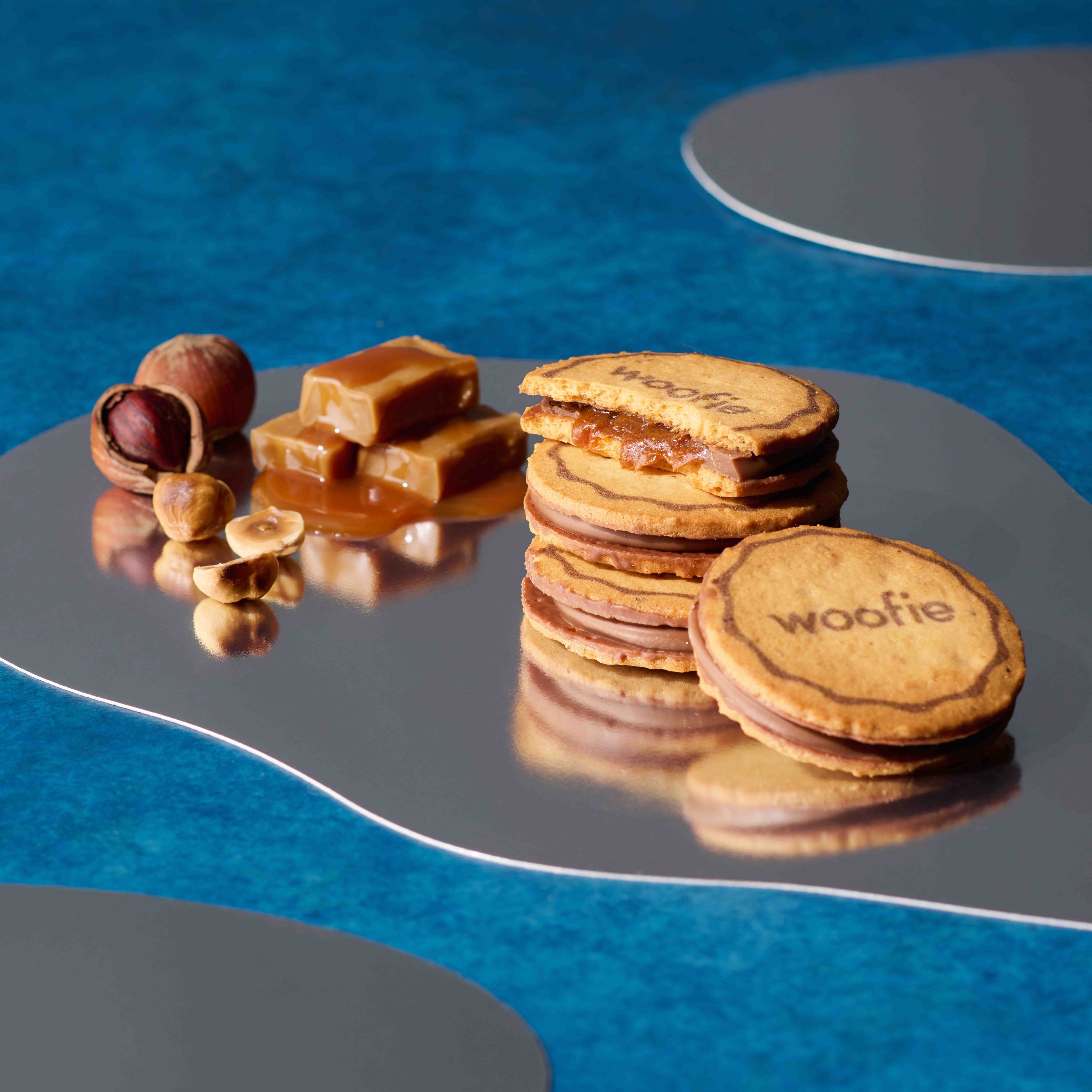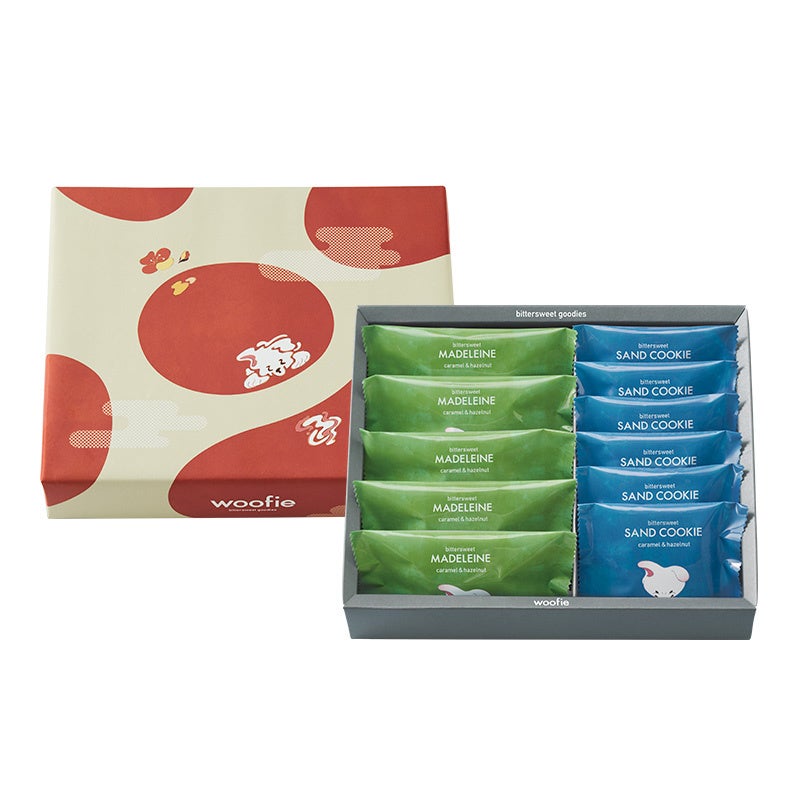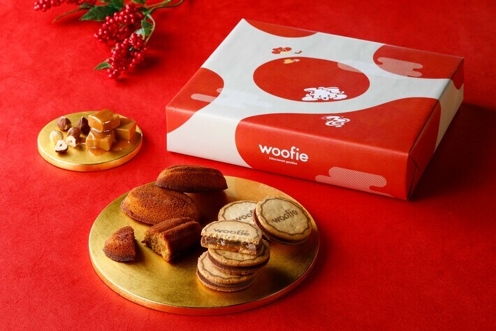 2024年4月に誕生した【woofie(ウーフィ)】は、ビターな深みとスウィートなやさしさがゆらゆらとにらめっこする、キャラメルとナッツのマリアージュをお届けするスイーツブランド。キャラメルとナッツがそれぞれの良さを引き立て合い、ひとつに溶け合う瞬間に広がるちょっぴりオトナなビタースイーツをご堪能ください。13日(土)に発売する『迎春ウーフィセレクション』は、1番人気の看板商品「サンドクッキー」と、しっとりと心地の良い食感の「マドレーヌ」を楽しめる詰合せです。どちらもキャラメルのビターな味わいとヘーゼルナッツの香ばしさが口いっぱいに広がる、ウーフィの遊び心あるオトナの味わいをおたのしみいただけます。