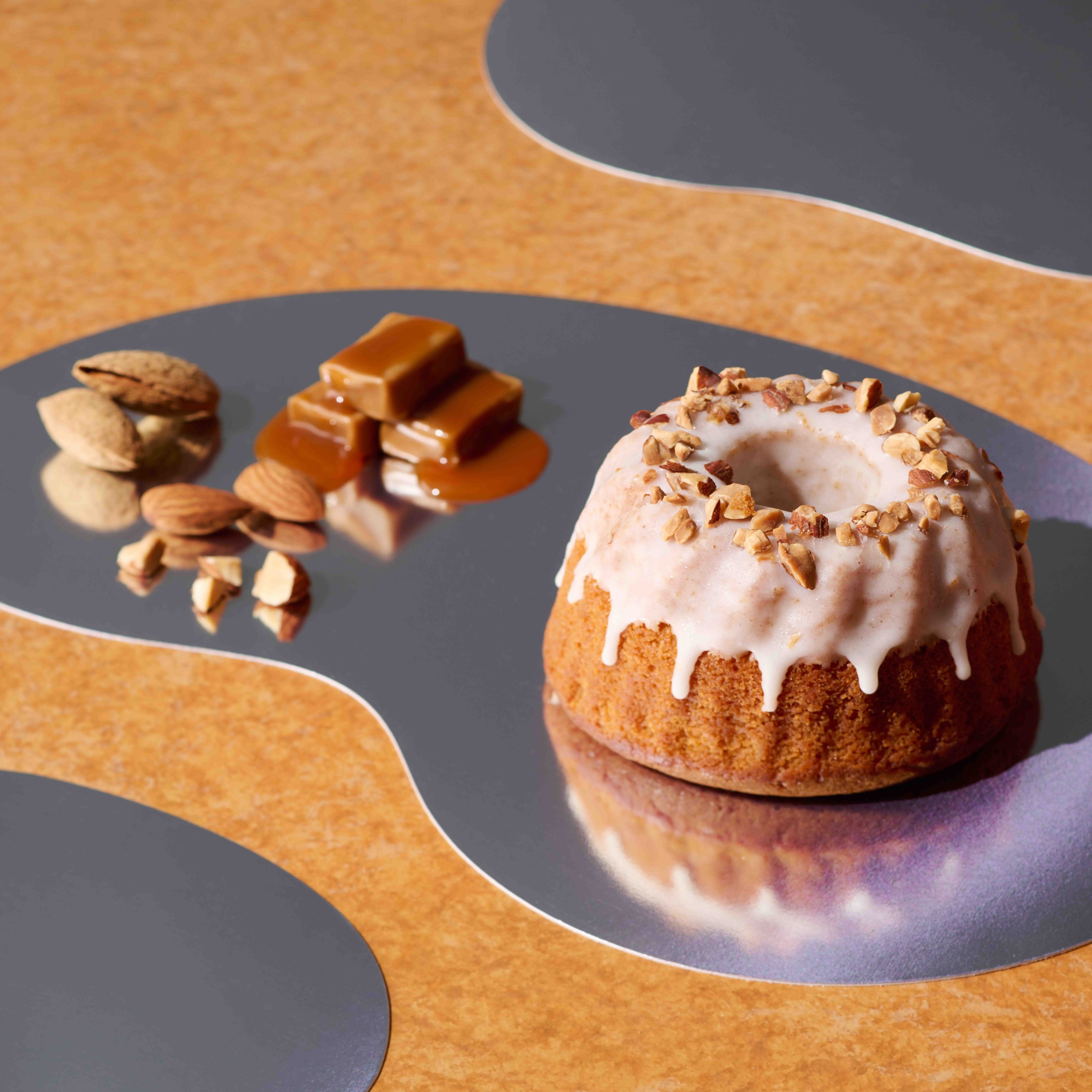 キャラメルを生地に練り込み、ていねいに焼きあげたベイクドケーキ。仕上げにグレーズをかけ、皮付きアーモンドをトッピング。キャラメルのビターな味わいと香ばしいアーモンドの薫りを、ほどよい塩味がひき立てます。