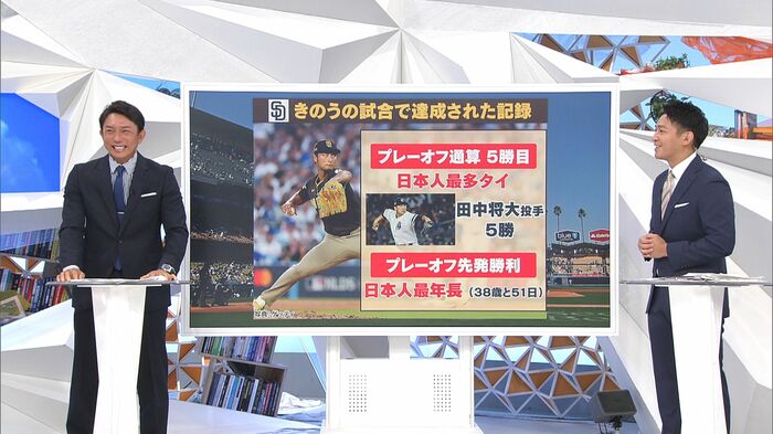 ダルビッシュ投手はプレーオフ通算5勝目を挙げて、田中将大投手が持つ日本人最多記録タイということになりました。さらにプレーオフ先発勝利としては、自身の持つ記録を更新する38歳と51日という、日本人最年長記録も更新しています。