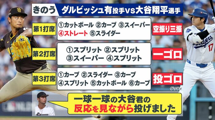 試合後、ダルビッシュ投手は「一球一球の大谷君の反応を見ながら投げました」と大谷選手を封じる策だったと話したんですね。