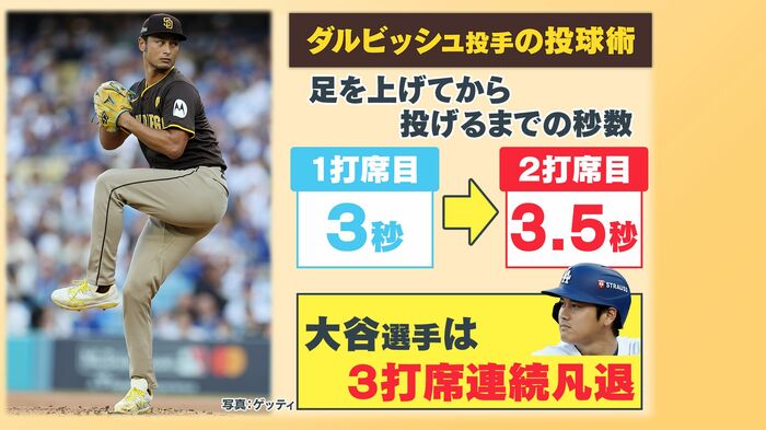 大谷選手とダルビッシュ投手の対決、1打席目と2打席目を比べると、左足を上げ始めてから投げるまでの時間がわずかに長くなっています。
