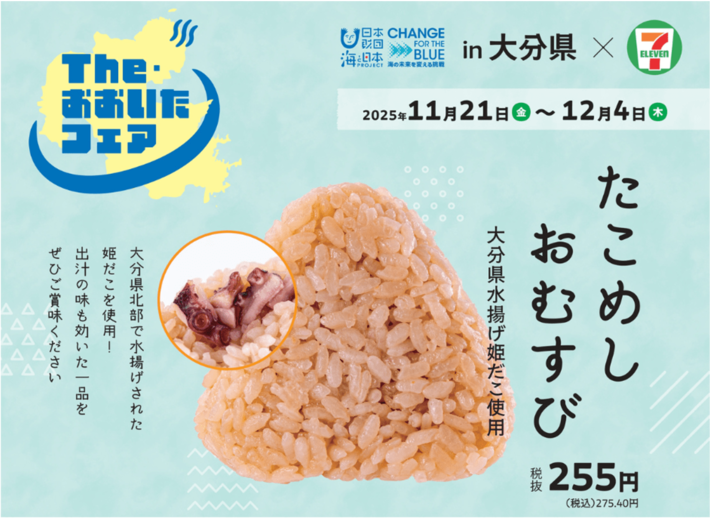 ・開催概要 大分県内のセブン‐イレブンにて期間限定で「たこめしおむすび」を販売海洋ごみ削減の呼びかけとして店舗周辺の清掃活動を実施