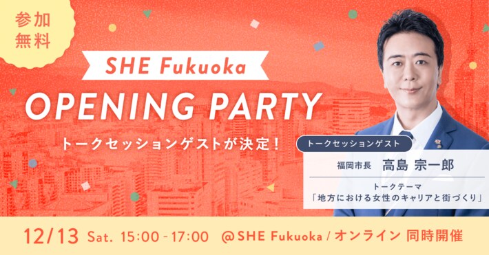 女性のためのキャリアスクール「SHElikes(シーライクス)」を運営するSHE株式会社(所在地:東京都港区、代表取締役CEO/CCO:福田恵里、以下SHE)は、九州の新拠点「SHE Fukuoka」のオープンを記念し、「SHE Fukuoka オープニングパーティー」を、2025年12月13日(土)に開催いたします。イベント当日は福岡市長の高島宗一郎氏をお迎えし、SHE代表の福田恵里と「地方における女性のキャリアと街づくり」をテーマにトークセッションを行います。自治体・企業・地域コミュニティとの連携を深めながら、福岡を起点に九州全体の女性活躍推進を目指してまいります。