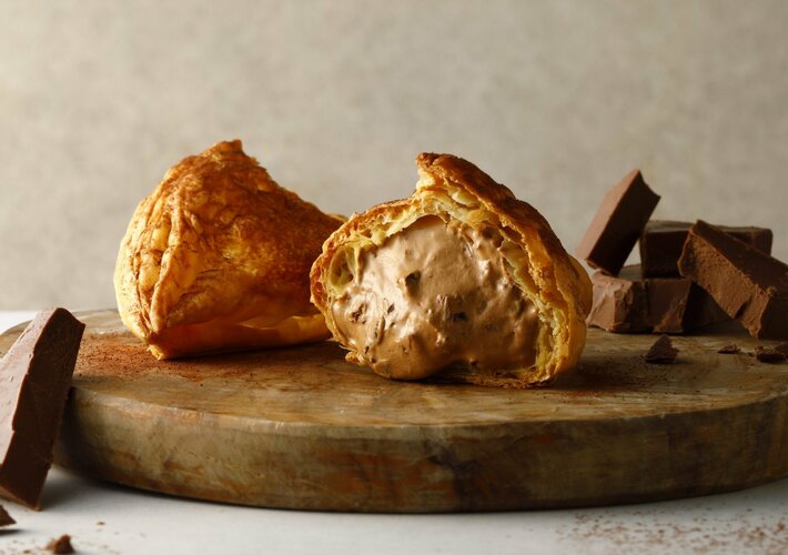 『ミルクパイ ショコラ』は、自慢のサクサクパイに、味わい豊かで深みのあるチョコレートホイップと北海道産のマスカルポーネチーズと練乳を合わせたまろやかなクリームを閉じ込めました。仕上げにビターな味わいのチョコフレークを加えることで、さらにチョコの味わいをお楽しみいただけるた冬限定のミルクパイです。