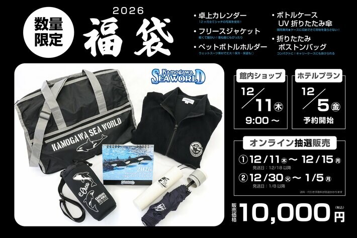 株式会社グランビスタ ホテル&リゾート(本社:東京都千代田区、代表取締役社長:荒井 幸雄)の基幹施設である鴨川シーワールド(千葉県鴨川市、館長:勝俣 浩)では、福袋限定のアイテム5点を封入した「鴨川シーワールド 2026年福袋」を2025年12月11日(木)から販売します。