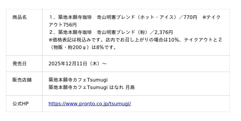 飲食チェーン「PRONTO(プロント)」などを展開する株式会社プロントコーポレーション(本社:東京都港区、代表取締役社長:杉山和弘)は、「築地本願寺カフェ Tsumugi」「築地本願寺カフェ Tsumugi はなれ月島」 にて「築地本願寺珈琲 竒山明憲(はやま みょうけん)ブレンド」を2025年12月11日(木)より発売いたします。