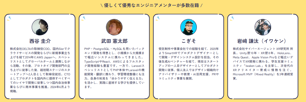 有名IT企業で働くテックリードクラス以上のメンターから実務で活躍するためのスキルを学ぶことができるエンジニアスクールです。ITエンジニアを目指す社会人や学生を支え、学びから転職までを一貫してサポートします。
