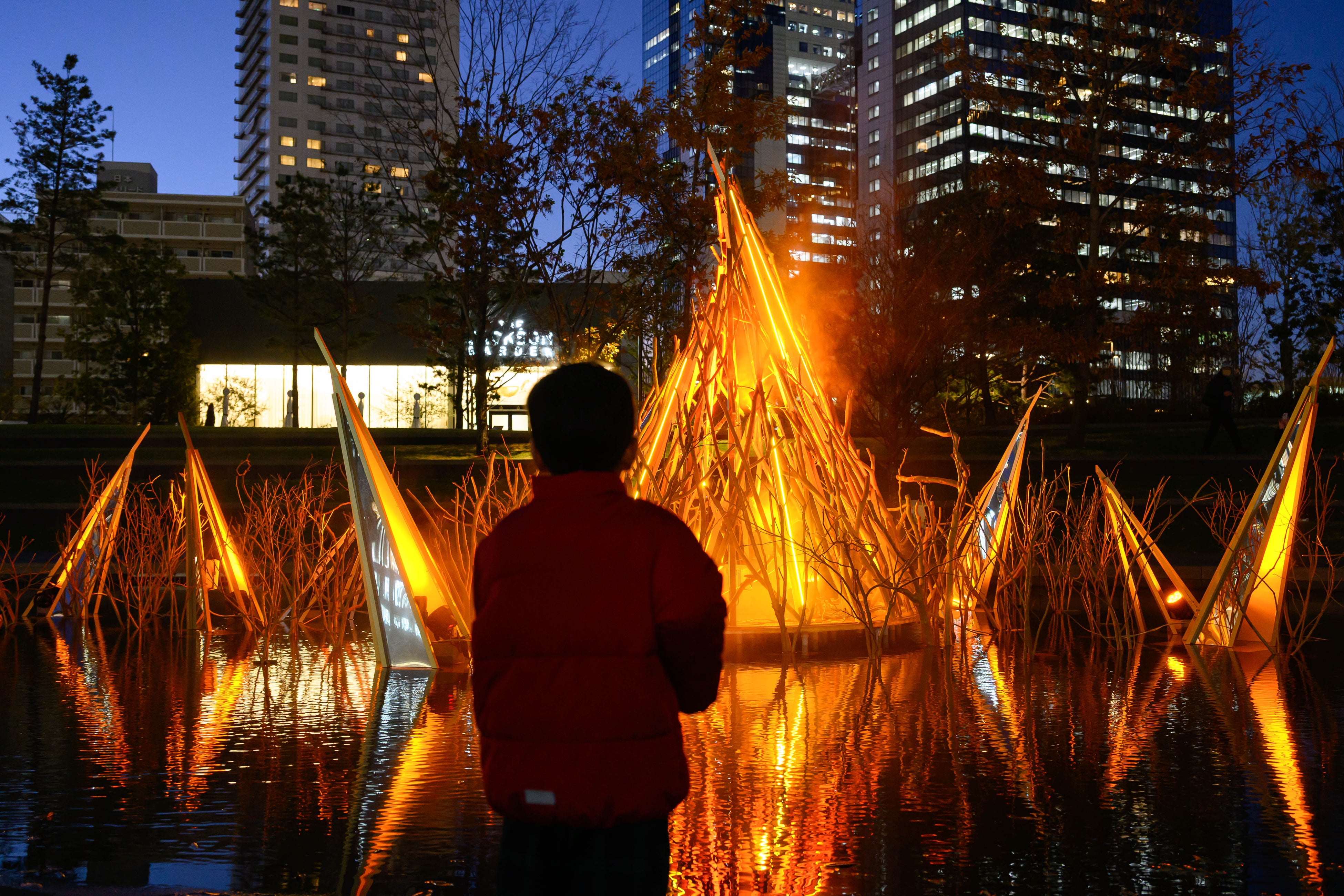 水盤エリアに設置された『THE KAGARIBI』が初点灯。炎を模した光の演出が水面に反射し、都市空間に揺らめく炎が浮かび上がる印象的な光景、さらに薪がはじけるようなインスタレーション音源も組み合わさり、寒さ厳しい冬の公園においても視覚的・聴覚的にあたたかさを感じて頂く最新のスポットとして初日から話題となりました。