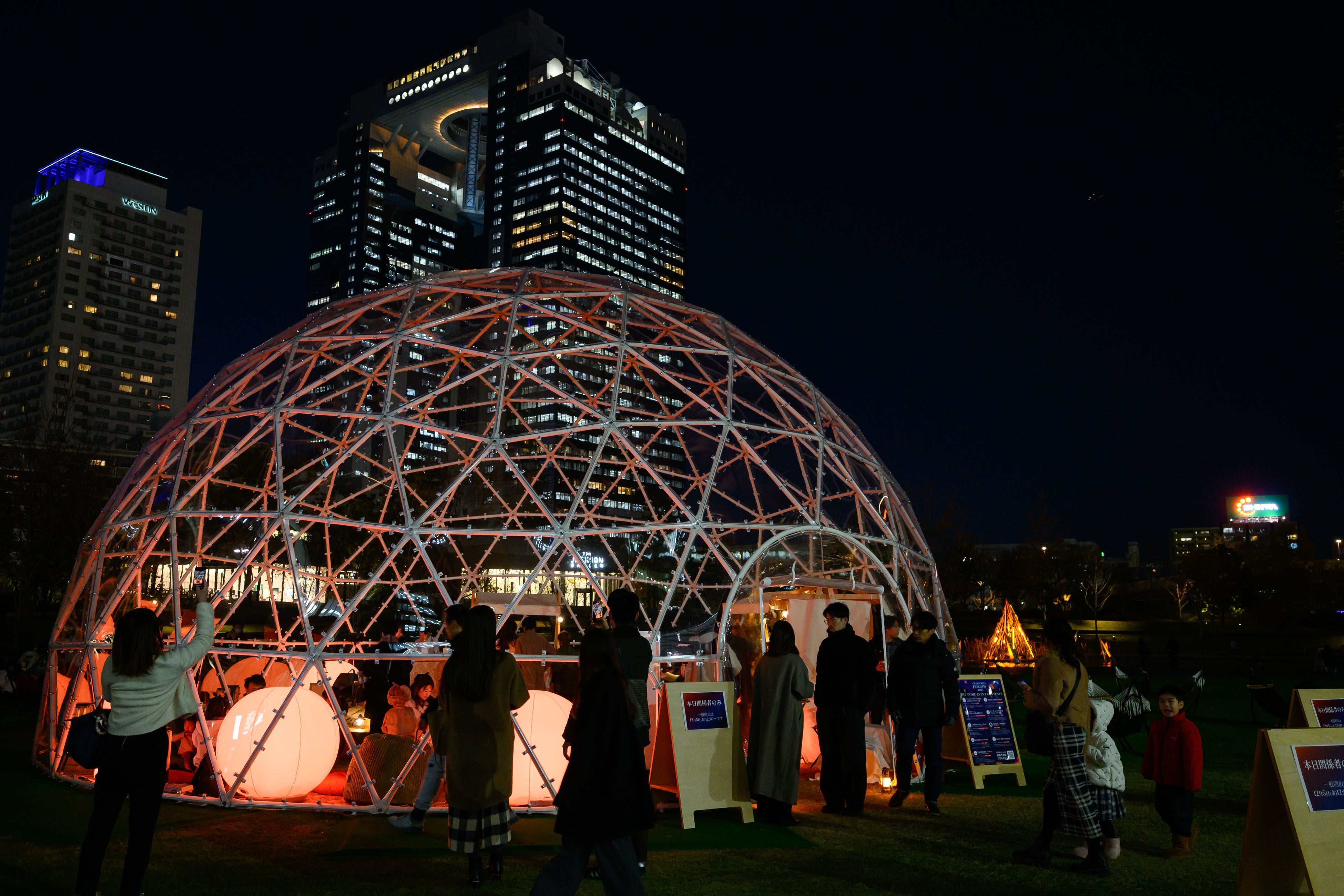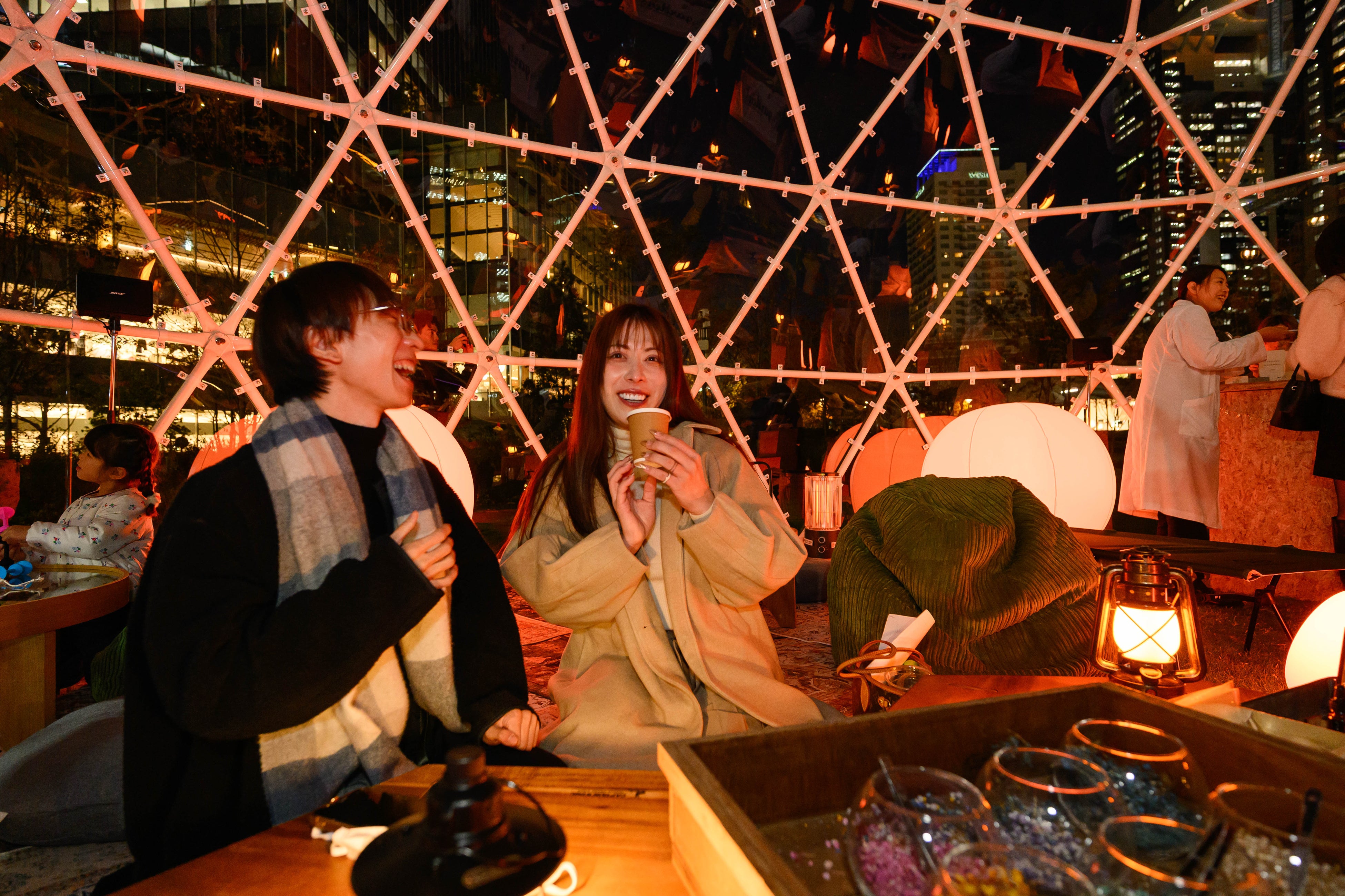 直径11m・高さ6mの巨大な透明ドーム『THE DOME』を公開し、寒さの中でも “あたたかい”滞在空間をお楽しみいただきました。ドーム内では、読書やボードゲームなど、多様な体験コンテンツを提供。夜は琥珀色の光に包まれた幻想的なナイトラウンジとして注目を集めました。