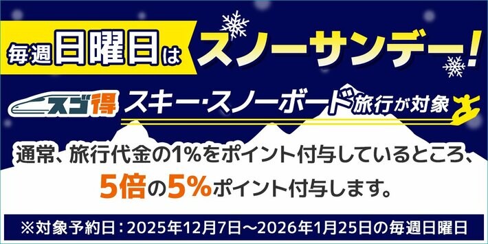 東武トップツアーズ株式会社(本社:東京都墨田区、代表取締役社長:百木田康二)は、2025年12月7日(日)~2026年1月25日(日)までの期間限定で、交通機関と宿泊、リフト券やレンタルスキー・スノーボードがセットでお得な「スゴ得」スキー・スノーボード旅行を、期間中の毎週日曜日にご予約された方を対象に、トラベルポイント付与率が通常の5倍になるキャンペーンを実施いたします。