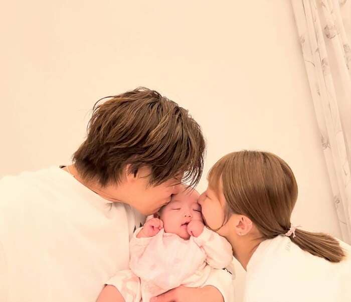 妻・辻󠄀希美さんと生後3ヶ月次女を挟んだ、ほほえましいキスショットを公開しました。