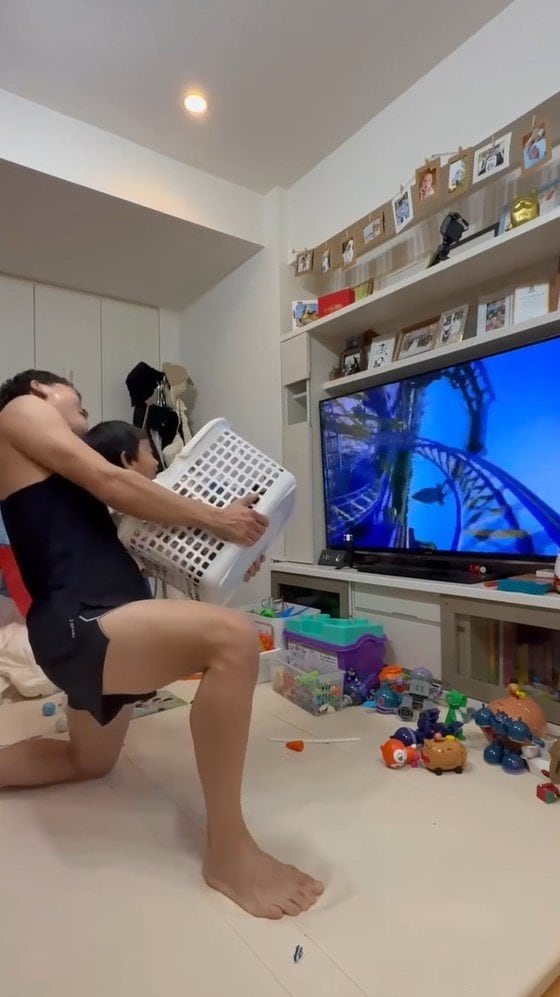 おばたのお兄さんは、洗濯かごに入った2歳の息子を洗濯かごごと持ち上げ、足を大きく開き中腰になり、前をまっすぐに見つめています。