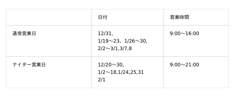 ※1/1のみ営業時間10:00~16:00。積雪状況や天候によって、営業時間の変更がございますので、事前に公式HPをご確認ください。