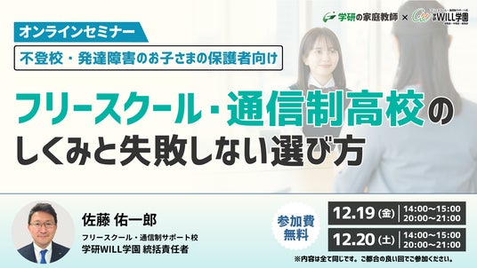 株式会社 学研ホールディングス(東京・品川/代表取締役社長:宮原博昭)のグループ会社、株式会社 学研エル・スタッフィング(東京・高田馬場/代表取締役社長:伊藤弘雅)は、展開する「学研WILL学園」「学研の家庭教師訪問支援室」で、この時期にご相談が増える、進路選択に関わる制度の仕組みや、多様な学びの選択肢に関する疑問について理解を深めていただくため、2025年12月19日(金)と12月20日(土)に「不登校・発達障害のお子さまの保護者向け~フリースクール・通信制高校のしくみと失敗しない選び方」無料オンラインセミナーを開催いたします。