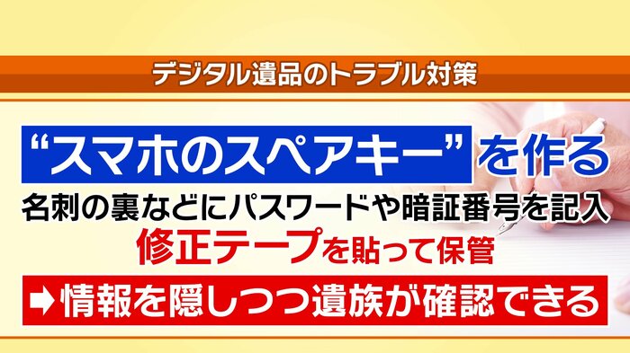 秋野さんは「娘に言われて、エンディングノートに全部書き出して、毎年更新するようにしている。スマホのロックの解除も、業者に頼むと高額になると聞いたので、パスワードも書いている」と対策を語ると、中谷さんは「まずは家族で話し合いの時間を取ることが大切」と大きく頷きました。