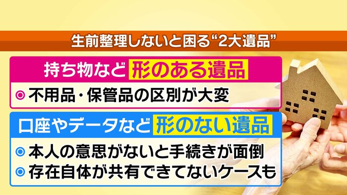 中谷さんによると遺族が残されて困るものには、不用品なのか保管品なのかが区別しづらい「形のある遺品」と、銀行口座やPCやスマホのデータといった「形のない遺品」があるといいます。