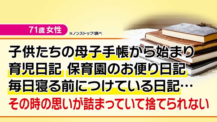 「母子手帳や育児日記、保育園の日記や自分の日記などが捨てられない」という71歳の女性のお悩みでは、中谷さんが「家族みんなで読み返してから捨てる。あるいは日記には『亡くなったら処分してほしい』とメモを残すと良い」と助言を。