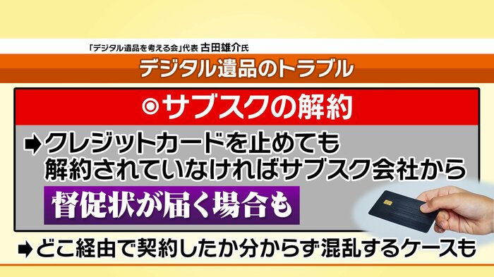 料金を引き落としているクレジットカードを止めても解約にはならならず、(遺族のもとに)督促状が届いて驚く例も多く、解約をしたくても家電量販店や携帯電話会社など、サブスクを契約した窓口がわからないとたらい回しにされてしまうといいます。