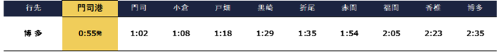 ※主要駅の到着時刻を記載しています。詳細な時刻につきましては、JR九州ホームページ「駅別時刻表」をご参照ください。 「駅別時刻表」はコチラ