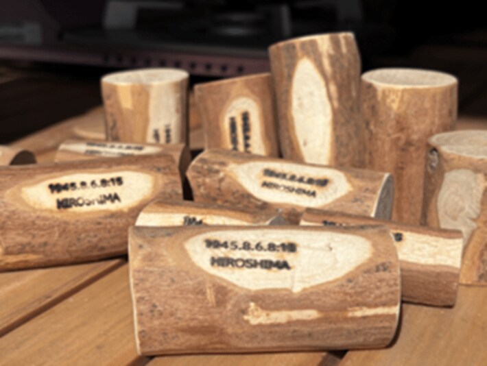 剪定枝はキーホルダー(直径3~6cm×厚さ1cm)や香りを拡散させるディフューザー(直径約3cm×長さ約5cm)に加工して、表面に「1945.8.6 8:15 HIROSHIMA」と焼き印を押しました。この木工品は、会場に設置した高さ約2mのクリスマスツリー型メッセージボードに、平和へのメッセージを記入した人にプレゼントします。来場者が「被爆樹木の継承者」として、平和への思いも持ち帰ってくれることを願っています。