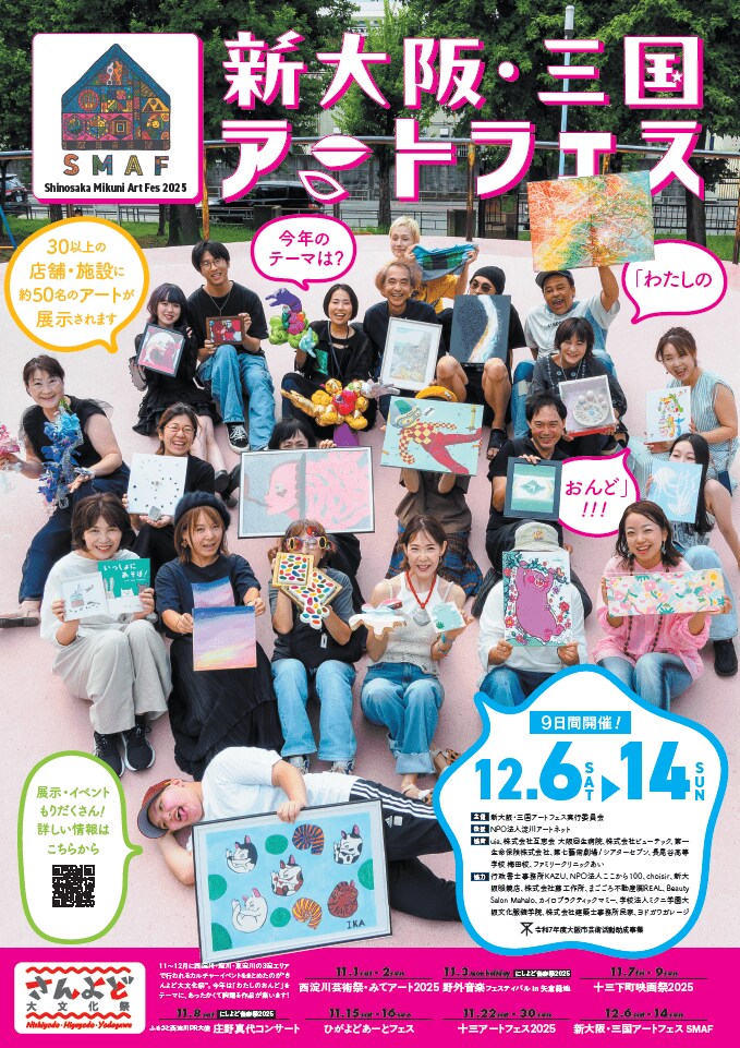 今回で2回目の開催となる『新大阪・三国アートフェス(SMAF)』は、新大阪・三国エリアの30以上の店舗・施設に、約50名以上のアーティスト作品が展示されるアートイベントです。西淀川区、淀川区、東淀川区で実施される「さんよど大文化祭」の一環として開催され、アート・映画・音楽を横断したカルチェーフェスとして各地で展開されます。