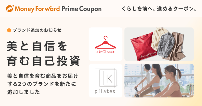 マネーフォワードホーム株式会社は、お金の見える化サービス『マネーフォワード ME』プレミアム会員限定「Prime Coupon(プライムクーポン)」の第七弾として、本日2025年12月5日(金)より新たなクーポンを提供開始します。第七弾は「美と自信を育む自己投資」をテーマに、月額制ファッションレンタルサービス『airCloset(エアークローゼット)』を提供する株式会社エアークローゼット、女性専用マシンピラティス専門スタジオ『pilates K(ピラティス ケー)』を提供する株式会社 LOIVEの2社を新たにパートナー企業として迎えました。