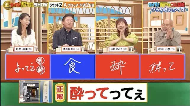 正解は「酔って(寄って)ってぇ」。野村さん、山野さん、成瀬さんの3人が正解。