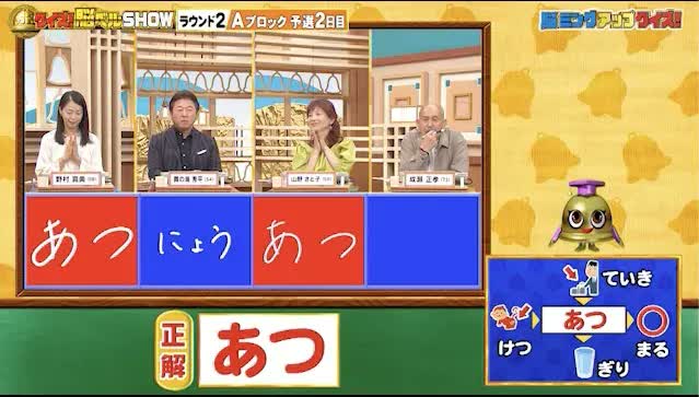 正解は「あつ(低気圧・集まる・厚切り・血圧)」。野村さんと山野さんが正解。