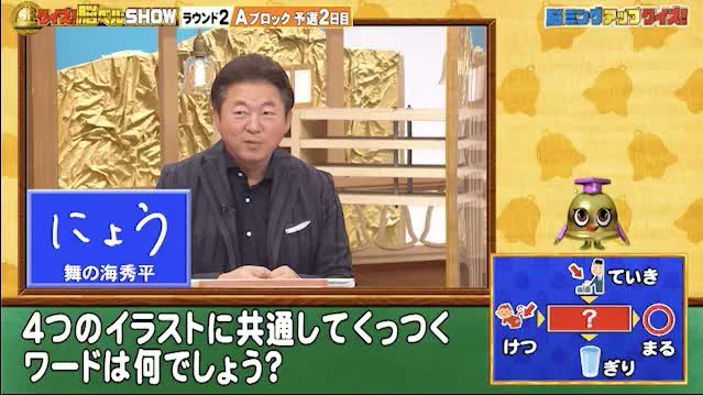 舞の海さんの答えは、「にょう」。「けつ[?]」だとしたら、すぐ病院へ行ったほうが良いと思います…。残念ながら不正解。