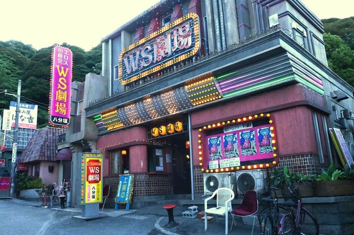 夜の八分坂は、煌びやかでまばゆい光が印象的。「正面(アーケード側)から見たネオン看板の重なり具合は、WS劇場を中心に、大きさや色味、形など細かくこだわりました」(棈木)と、計算して配置されているそう。