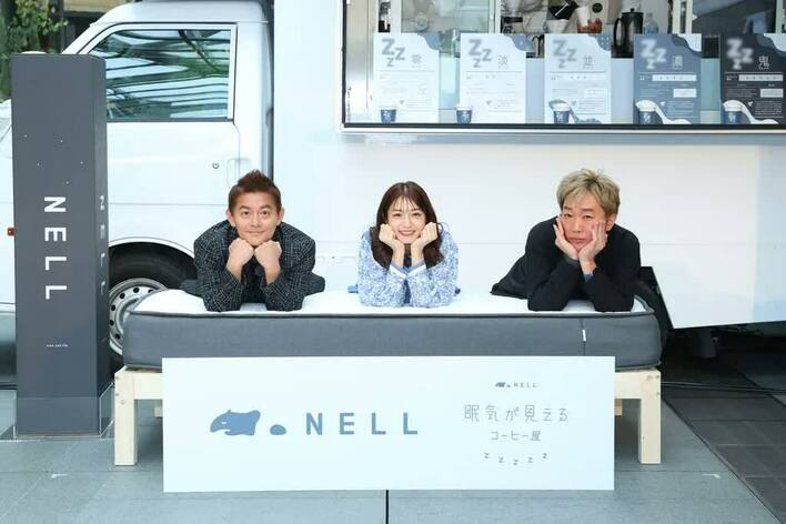 睡眠を測定し、眠気に応じてカフェイン量が変わるコーヒーを無料で提供する「眠気が見えるコーヒー屋」のオープニングセレモニーが行われ、スピードワゴンと中村静香さんが登壇しました。