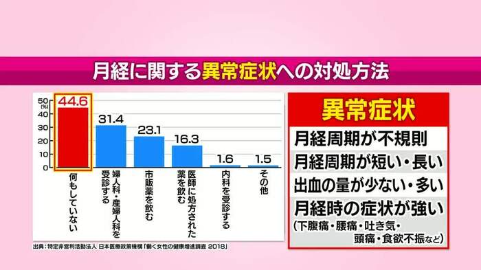 「いつか子供がほしいという20代の後輩が、婦人科に行くのはハードルが高いと言っている」というエピソードも紹介されましたが、実際、番組の調査によると、20〜30代では生理不順があっても「何もしていない」という人が、44.6%もいるといいます。