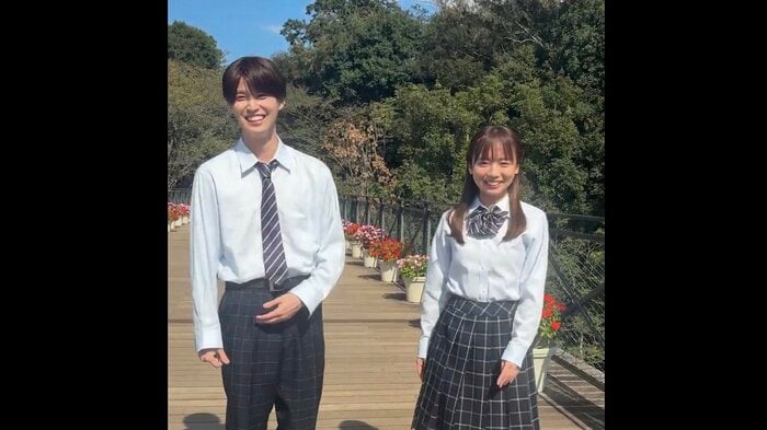 2人とも白色のシャツに、それぞれストライプ柄のリボンとネクタイ、チェック柄のスカートとパンツを合わせた、さわやかな学生服姿を披露。