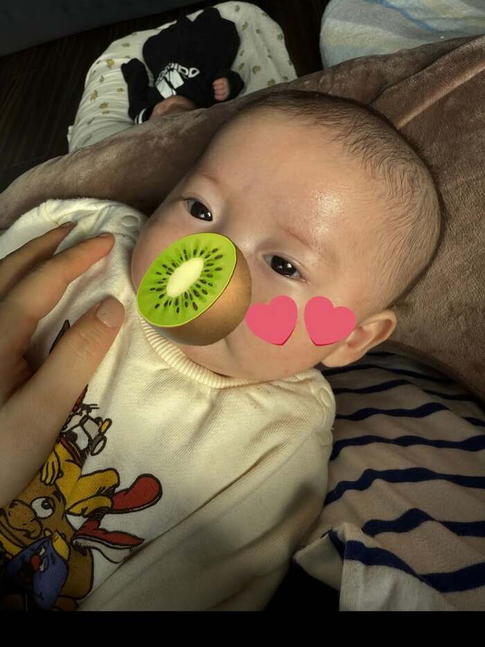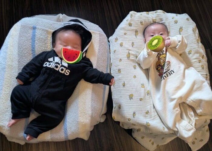 さらに、ふかふかのクッションの上で手を次男の方にぐっと伸ばして気持ちよさそうに眠る長男と、目をぱっちりと開けて起きている次男が手をグーにして一人遊びをしているようなそれぞれの個性があふれたかわいらしい姿も披露されています。