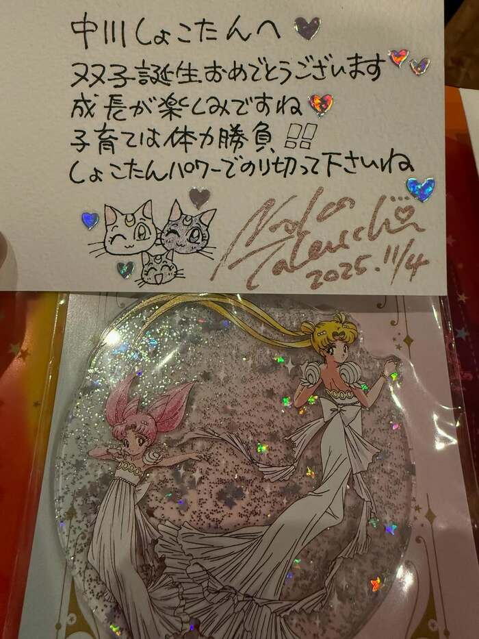 メッセージカードには「双子誕生おめでとうございます 成長が楽しみですね 子育ては体力勝負!!しょこたんのパワーで乗り切って下さいね」という温かいコメントとともに、ルナやアルテミス、ダイアナなど猫のイラストやサインが描かれています。このプレゼントに中川さんは「夢?!夢よりすごいミラクル!!ありがとうございます!!家宝!!かわいい♡」とうれしさをあわらにし、「セーラームーンは私が人生で1番描いた人物です」「双子たち良かったね 本当にすごいね いつかいかに凄い素晴らしいことかを伝えなきゃ」とつづっています。