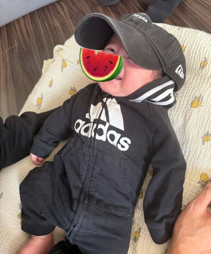 他にも、黒いアディダスのロンパースに大人用のキャップをかぶった長男が、口を開けてにっこりと笑っている様子や・・・