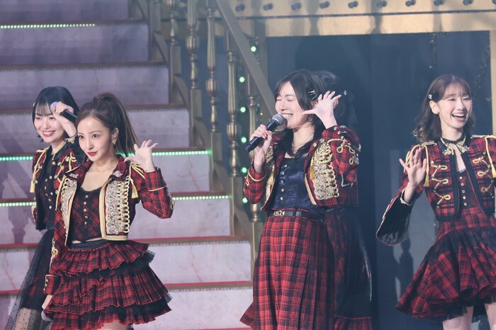 AKBを象徴する赤チェック衣装で、板野さんや小嶋さん、松井珠理奈さんら豪華OGと披露し、前田さんは「水玉のシュシュ」の歌詞部分では、満開の笑顔でポーズを決めていました。