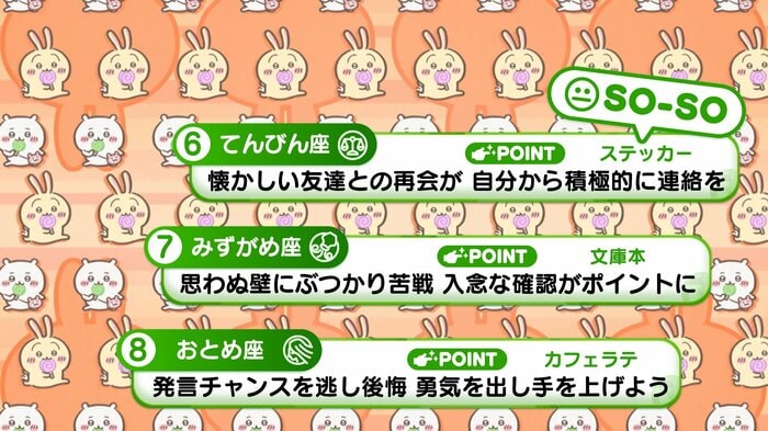 『めざましテレビ』で放送中の「ちいかわ占い」 テレビ放送がない日はお休みで、月~土:朝7時以降に更新予定です。