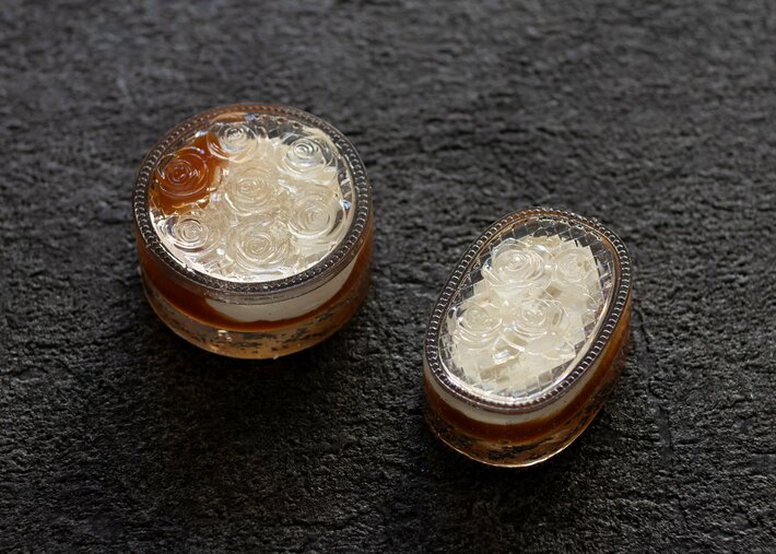 「光を味わう」というをコンセプトとした造形様式と、優美な薔薇の文様を統合。透明感のある琥珀羹(水晶)の中に、深く煮込んだキャラメルと、濃厚なバター練り物を封じ込めた水晶酪菓(すいしょうらくか)です。