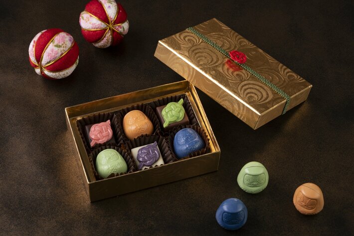 強運カラー6色の達磨と水引を模ったチョコレートの詰め合わせ。達磨は、男性の強運カラー、水引には女性の強運カラーを用い、それぞれ異なる味わいをお楽しみいただけます。また、お子さまにぴったりの可愛らしい仔午、躍動感を表現した午など本物と見間違えるようなチョコレート細工もご用意いたしました。