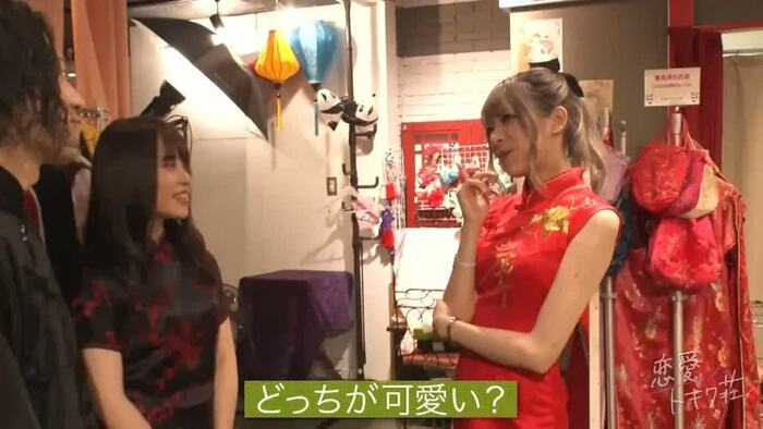 和平さんが、ゆのさんとことまろさん2人分のチャイナドレスを選び、それぞれ着替えます。