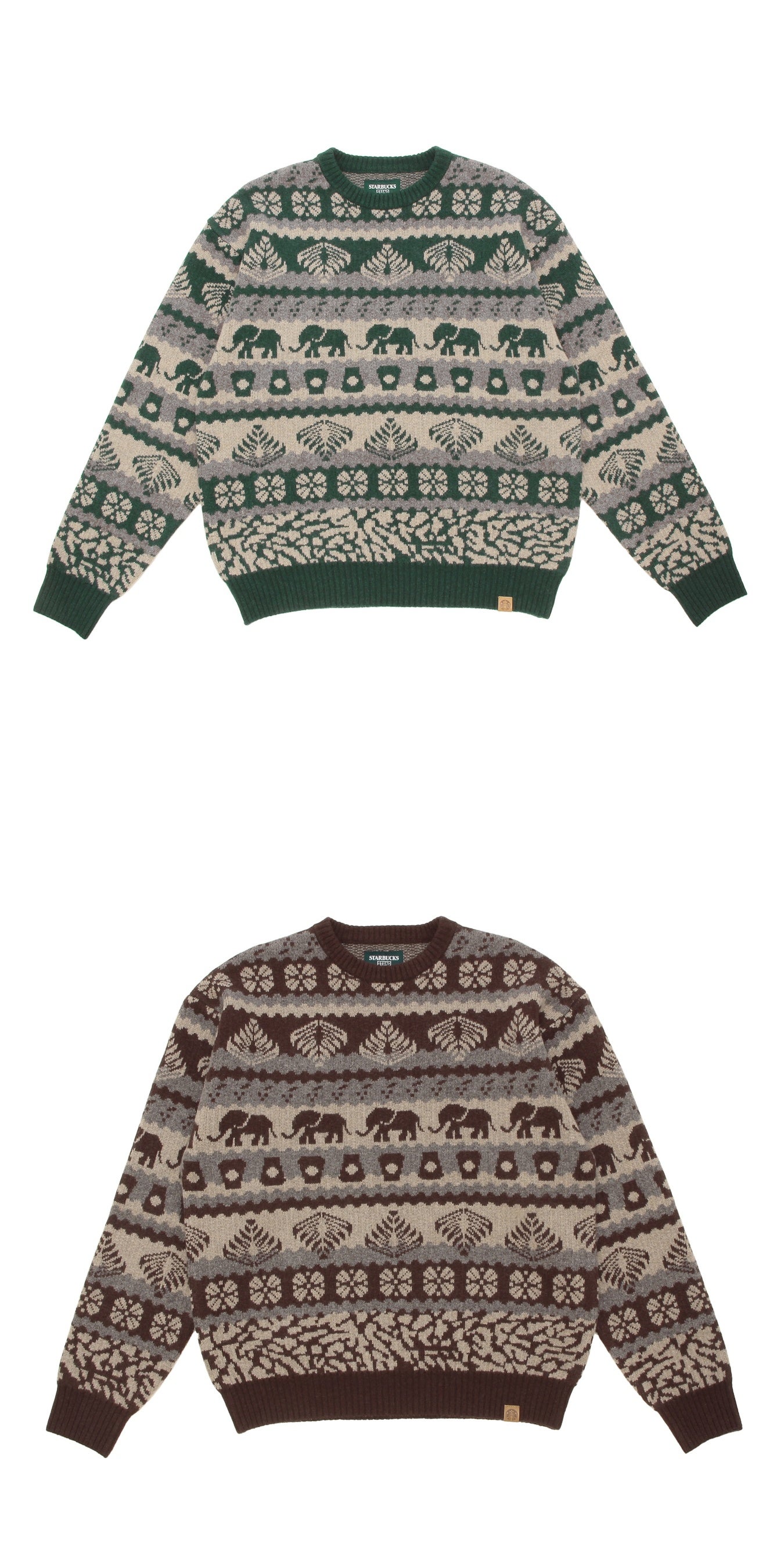 ジャカードクルーニットは、オリジナルの柄を制作し、ジャガードで表現した5GGウールニットです。アフリカゾウやラテアート、スターバックスのカップやコーヒー豆が遊び心たっぷりに描かれています。裏針抜きのウールジャガード編みにすることで、メランジ感もありつつ発色を良くさせオリジナル柄をはっきり表現しています。またウール100%による膨らみと触り心地の良さが高級感のあるアイテムに仕上げました。シルエットは、肩幅と身幅にゆとりを持たせ、袖口・裾はリブ仕様、またネックはできるだけ身体に沿わせるように設定しメリハリのあるシルエットに調整。ユニセックスでも着用できるようXS~XLまでの5サイズ展開です。