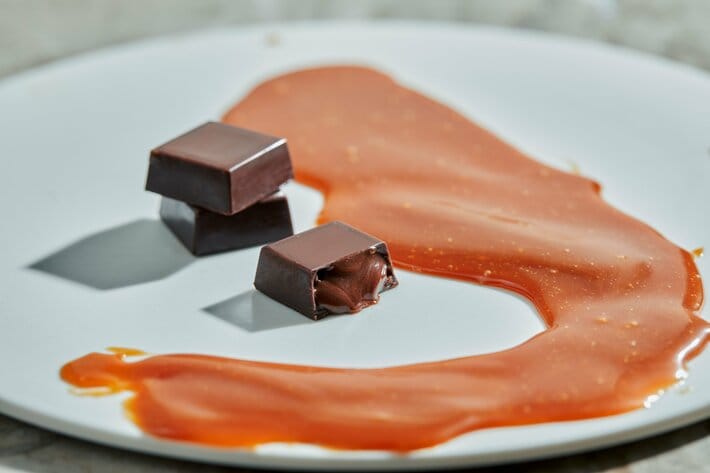 薄く繊細なビターチョコレートの中から、カカオバターで作るなめらかな生キャラメルがとろけ出します。