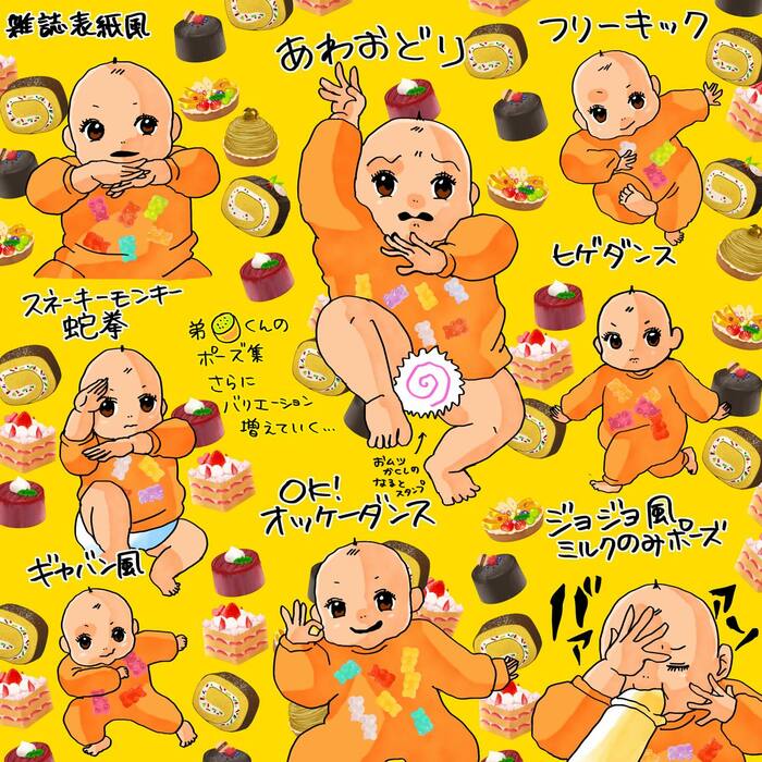 また、不思議なポーズをたびたび披露してくれる弟くんのショットを一挙に見ることができます。