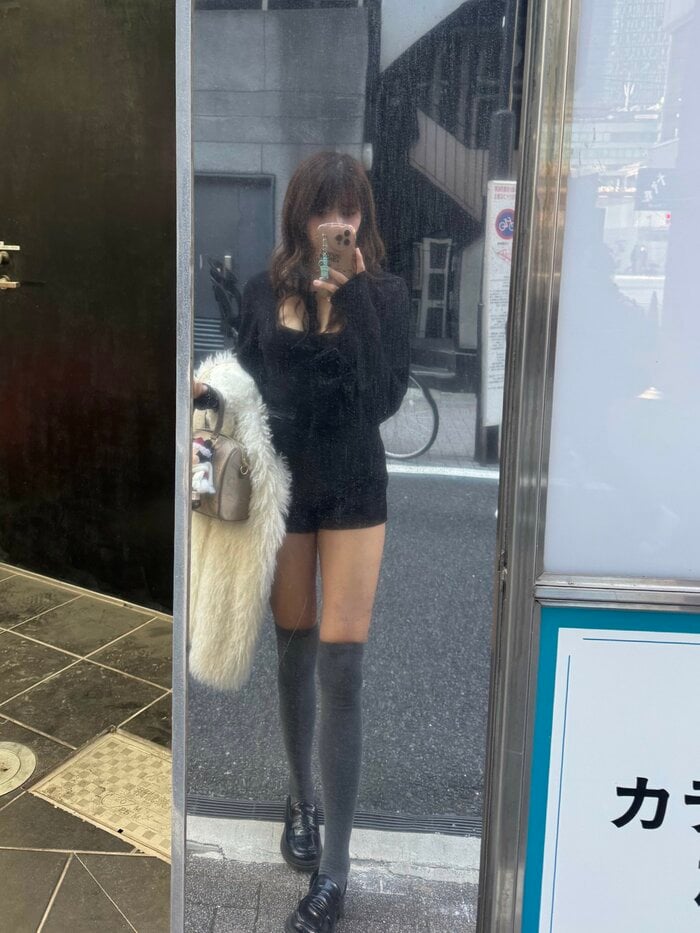 鏡越しに映るすらっと伸びた美脚に目が釘付けになってしまいます。