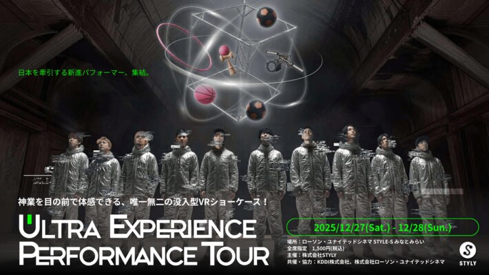 スクリーンで映画を楽しむはずの空間が、12月27日・28日の2日間、期間限定でパフォーマンスショーのライブ会場へと変身!エアダンス、フリースタイルフットボール、フリースタイルバスケットボール、けん玉、ディアボロ、フラフープなど、超人的な身体能力と圧倒的な表現力で世界を魅了するパフォーマーが集結し『ULTRA EXPERIENCE PERFORMANCE TOUR』と題した超没入型ショーケースを開催します。日本を代表するアーバンスポーツのトッププレイヤーやパフォーミングアーティストが魅せる珠玉のパフォーマンスを、VRの技術でダイナミックに、繊細に、ノンストップでお届けするという本公演。VRゴーグルをかけると音楽×パフォーマンスのスペシャルショーケースツアーがスタート!とある未来都市に迷い込んだような感覚で、一流パフォーマーたちによる圧巻のショーを特等席で体感することができます。スピード感あふれる超人技の連続で、テンションはMAXに!!劇場の最前列よりもぐぐっと近づける、超没入体験をお届けします。