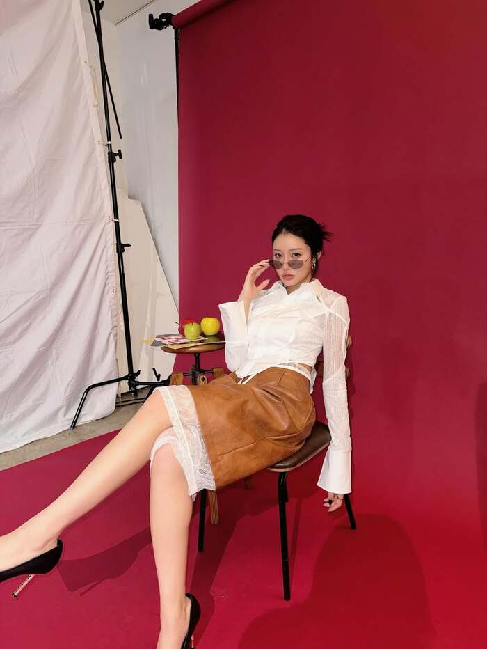 一部がシースルーになった白ブラウスに膝上丈のスカート姿で、サングラスをさげこちらを見つめていて、思わずドキッとしてしまいます。