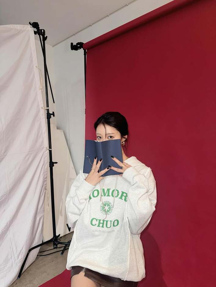 他にも、スタジオのような場所で撮影された写真では、オーバーサイズのスウェット姿の王林さんが、本で顔を半分隠すしぐさをする様子も。